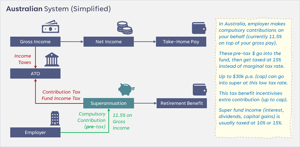 To give some initial context on how this deadweight loss is created, we first need sketches outlining how the mechanics of the two systems work. For Australia, the only relevant taxing point in our simplified example is the superannuation fund itself. This is because contributions to the fund are effectively taxed inside the fund as a ‘stream’ of fund income: