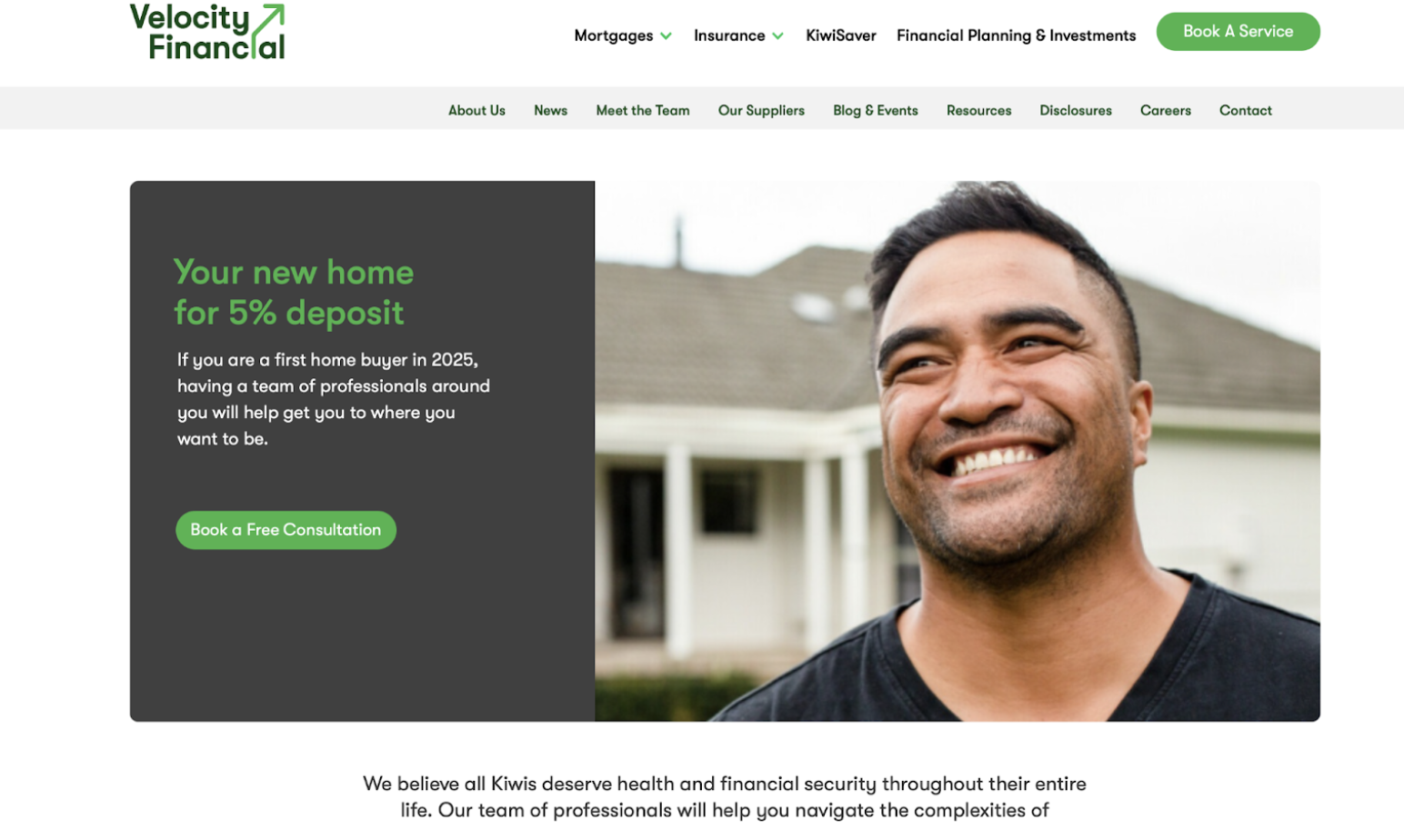 Velocity Financial, operating in New Zealand with a Wellington focus, specialises in mortgages, insurance, and KiwiSaver for security. They emphasise retirement through maximised KiwiSaver plans. Strengths include accessible consultations and proactive tools, but the multi-service model might not delve as deep into pure planning. Resources like blogs aid insights. They support first buyers to investors.